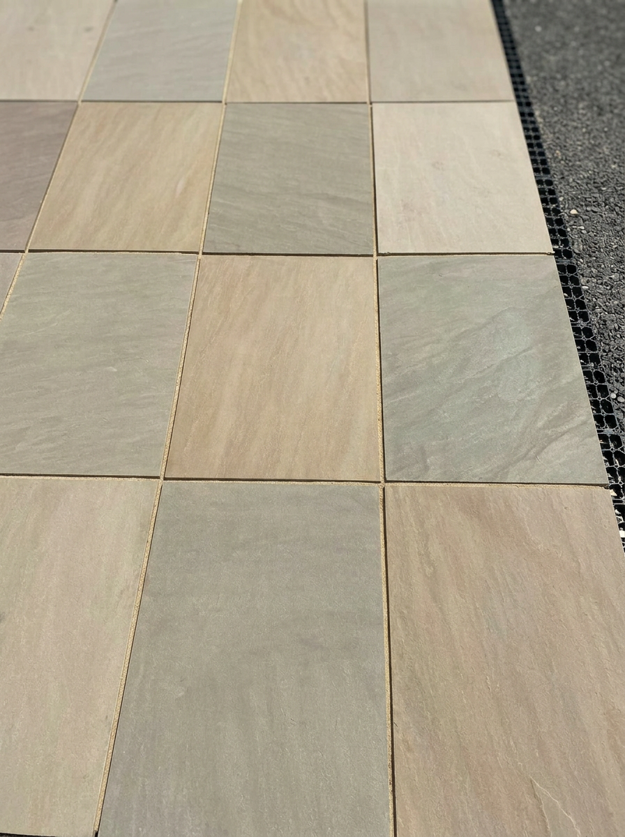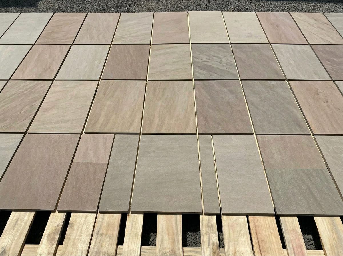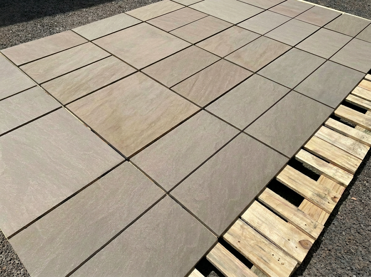 A faithful porcelain replica of the classic Raj Green natural stone — sage and grey tones laced with subtle rust veining. Like Kandla Grey, it's a long-standing favourite of the UK market and one of our consistent best-sellers.
