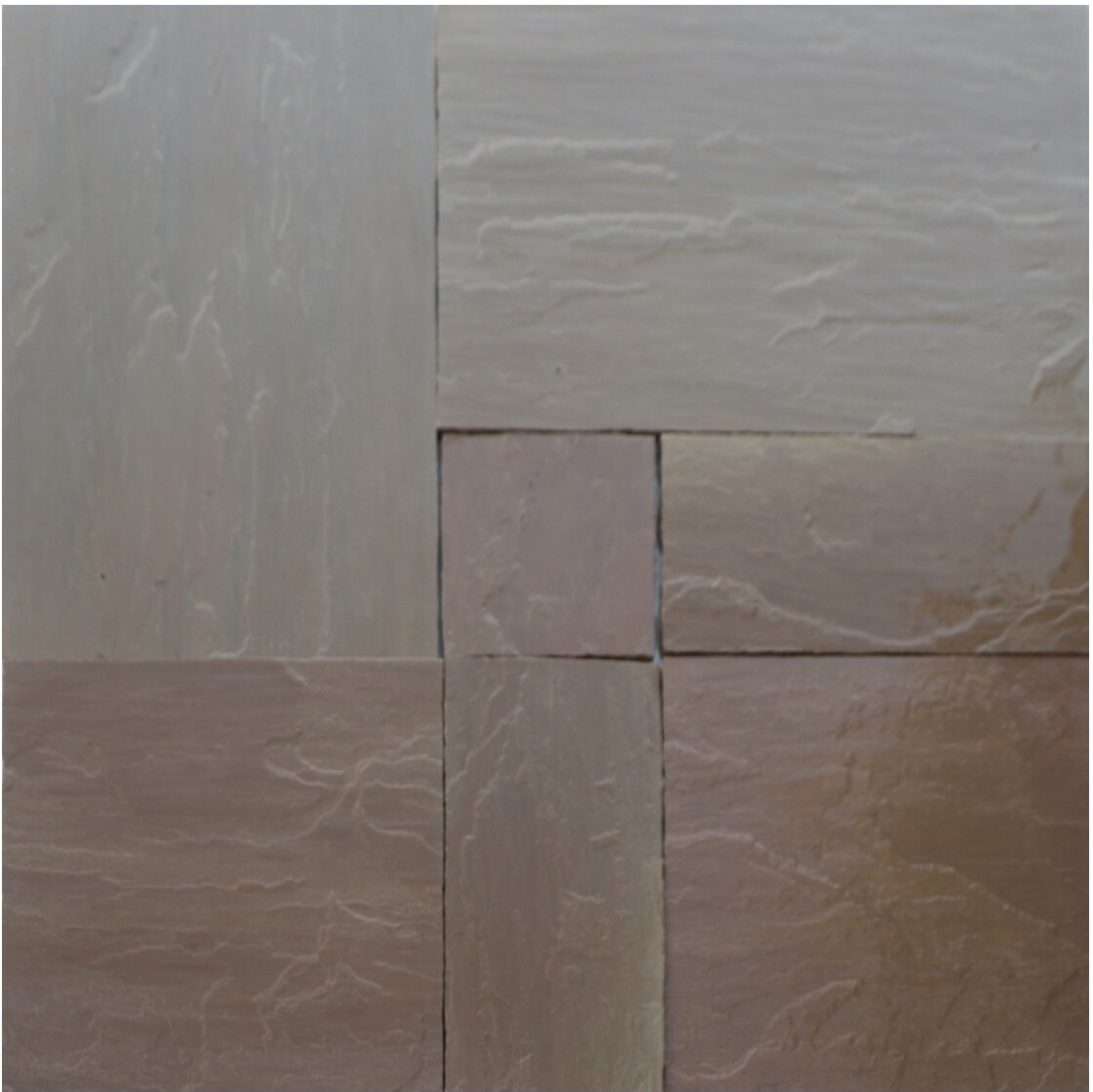 Raj Green Indian sandstone in a four-size patio pack at 22mm — soft greens, greys and rust tones with a riven surface.